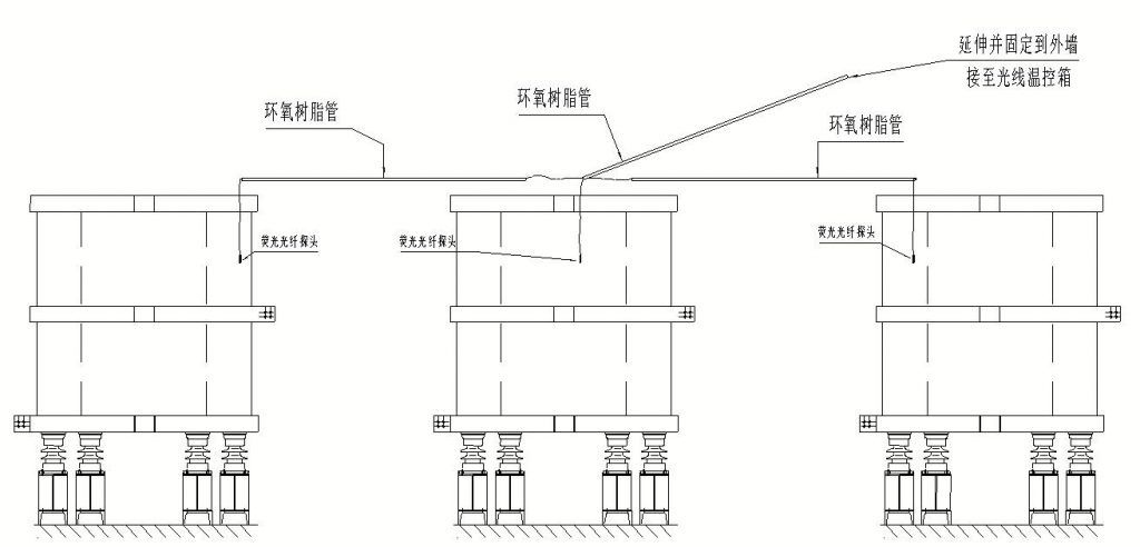 熒光式光纖測溫終端嵌入安裝在箱體,引出的光纖往墻體上部走,高度需要超過電抗器高度,經(jīng)過安裝在墻壁的環(huán)氧樹脂管,三根光纖匯總進(jìn)入B相電抗器;B相光纖直接安裝在電抗器內(nèi)部氣道壁內(nèi);A、C兩相分別經(jīng)過架空絕緣的環(huán)氧樹脂管引致A相、C相電抗器,安裝在電抗器內(nèi)部氣道壁內(nèi)。